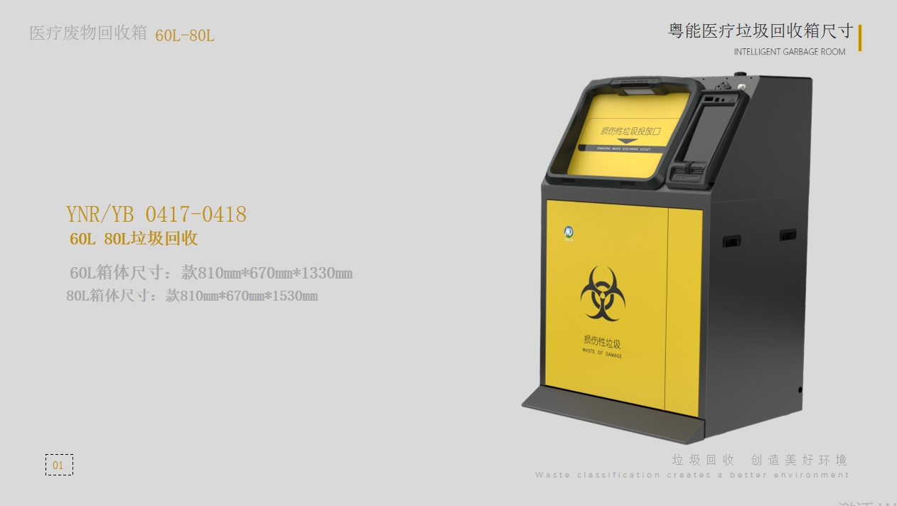 This equipment supports the classified recycling of medical waste, including infectious waste, damaging waste, etc. The equipment supports sealed UV photocatalytic sterilization, UPS power supply for guaranteed use, automatic weighing and billing, overflow warning reporting, intelligent patrol route planning and navigation, automatic aerosol fire extinguishing, and real-time alerts for abnormal events.